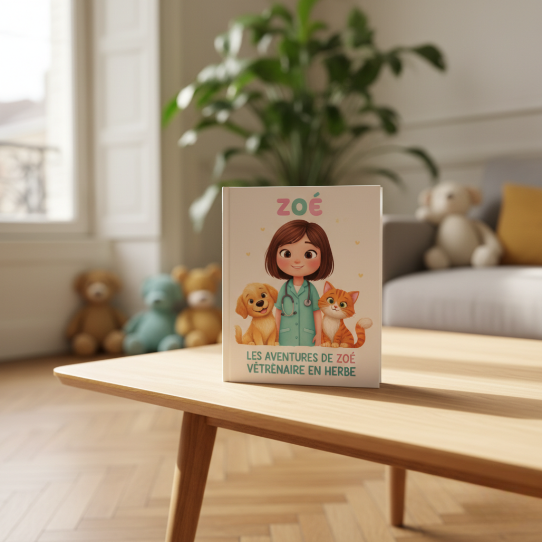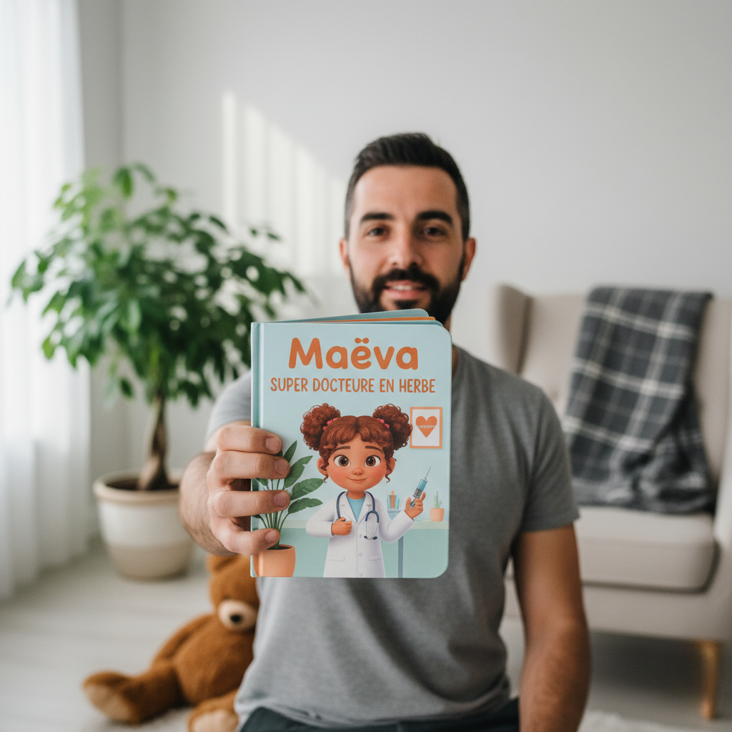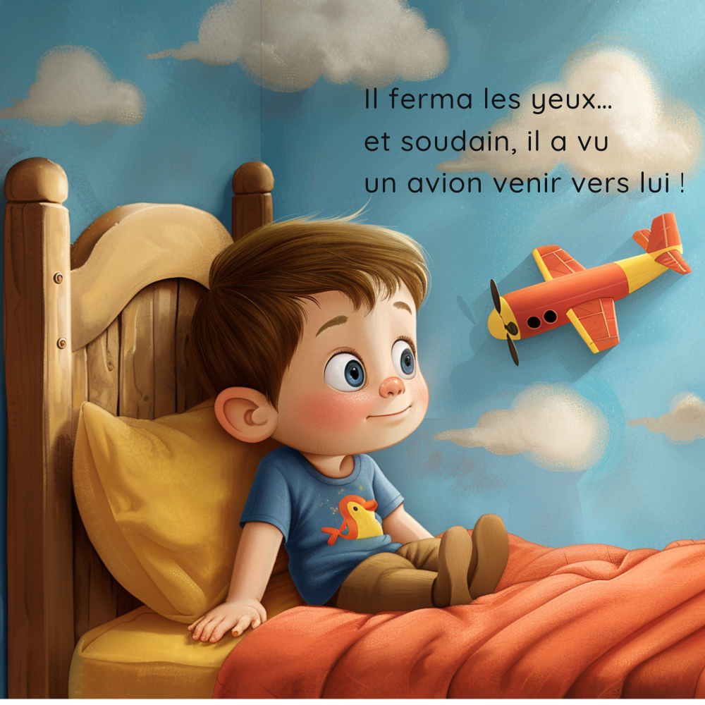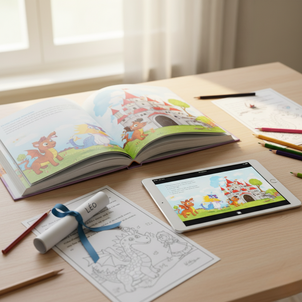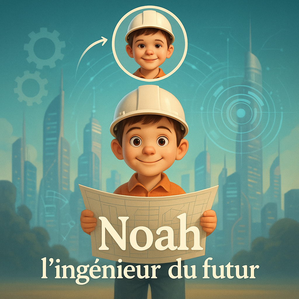 L’enfant est placé au cœur de la scène (style Pixar). Vous validez le rendu avant l’achat.