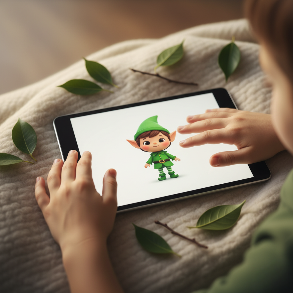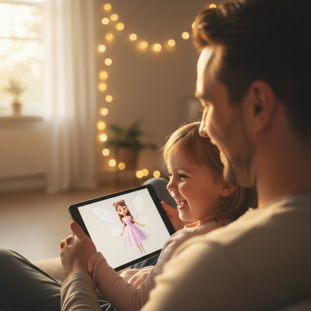Parent et enfant découvrant leur histoire personnalisée sur tablette