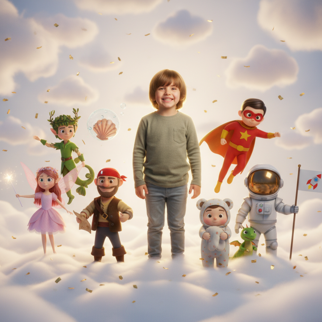 L’enfant est placé au cœur de la scène (style Pixar). Vous validez le rendu avant l’achat.