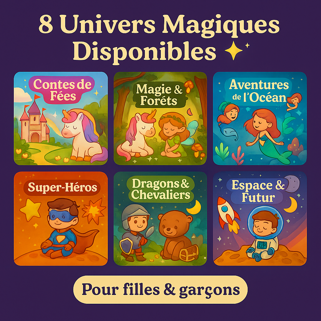 📚 Choix de 8 univers magiques : Contes de fées, super-héros, dragons, espace, pirates… fille ou garçon, chaque enfant trouve son monde préféré.